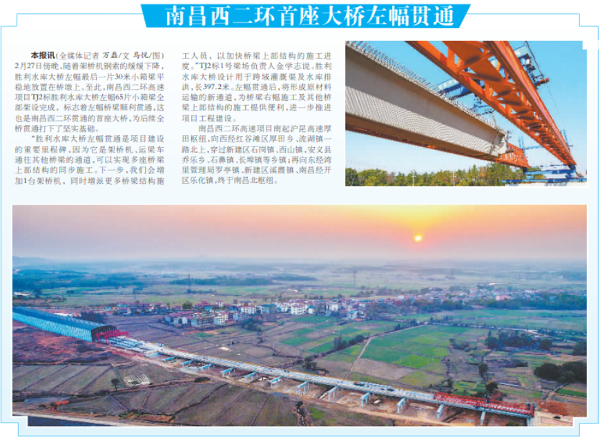 2月27日黄昏,,,,,随着架桥机钢索的徐徐下降,,,,,胜利水库大桥左幅最后一片30米小箱梁平稳地安排在桥墩上。。。。。。。。至此,,,,,南昌西二环高速项目TJ2标胜利水库大桥左幅65片小箱梁所有架设完成,,,,,标记着左幅桥梁顺遂意会,,,,,这也是南昌西二环意会的首座大桥,,,,,为后续全桥意会打下了坚实基础。。。。。。。。