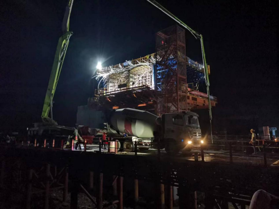 据项目认真人先容,,,,,,此次浇筑完成的标段最大跨度60+2*90+60米一连箱梁右幅83号主墩0号块,,,,,,长12米、高5.5米,,,,,,宽16.55米,,,,,,混凝土使用方量为433.6立方米,,,,,,接纳支架现浇的施工工艺,,,,,,施工历程中保存浇筑难度大、施工时间长、清静危害高等情形。。。。。。。。该一连梁“0号块”顺遂浇筑完成,,,,,,标记着东阳特大桥转入上部结构施工阶段。。。。。。。。为了确保此次一连梁0号块顺遂浇筑,,,,,,在南昌市尊时凯龙集团的统一安排下,,,,,,施工单位全心组织,,,,,,多次举行施工手艺交底,,,,,,明确从支架搭设到模板装置、钢筋帮扎等各个工序、环节的手艺规程和操作规范,,,,,,确保浇筑历程中的清静质量有序可控。。。。。。。。